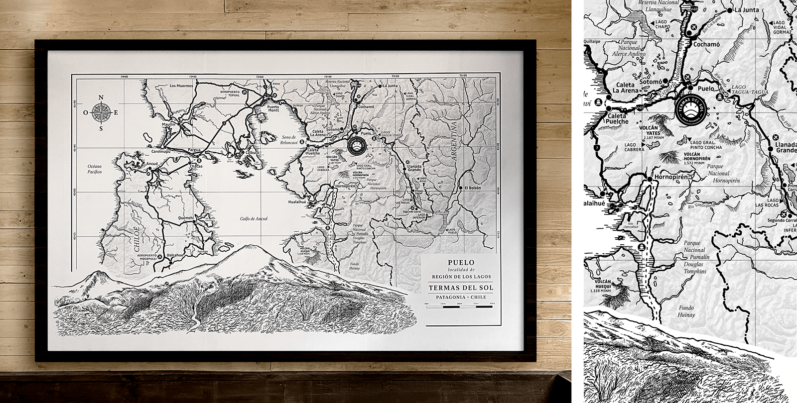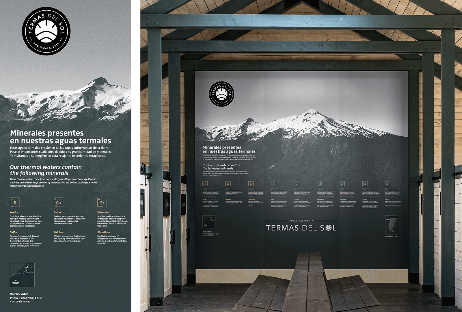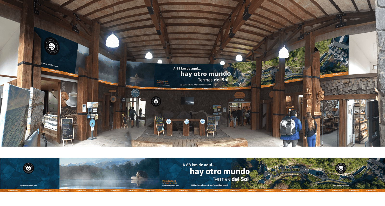 A partir de la Estrategia de Posicionamiento de marca, diseñamos múltiples piezas gráficas de branding publicitario para espacios públicos, incluidos un gran mural para el edificio de entrada a los Saltos del Petrohué, murales para las instalaciones de las termas, Un gigantesco letrero carretero que anuncia la llegada al lugar, folletería multiligüe, Infografías contenidos públicos y un sinnúmero de otros productos de diseño.